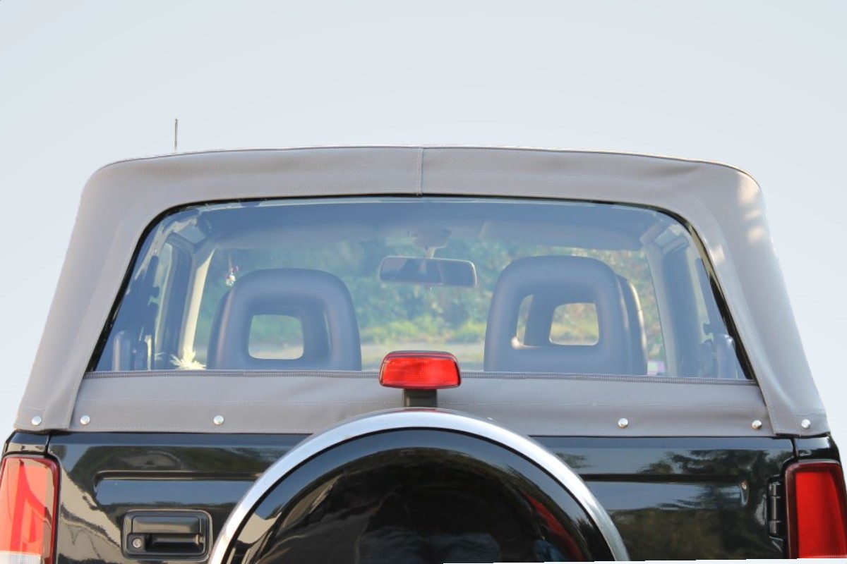 - Die Heckfensterscheibe Ihres neuen Suzuki Jimny Verdeck ist mit einem Reissverschluss versehen. Um ein einfaches öffnen von beiden Seiten zu gewährleisten, ist dieser Reissverschluss mit zwei Schieber ausgestattet.